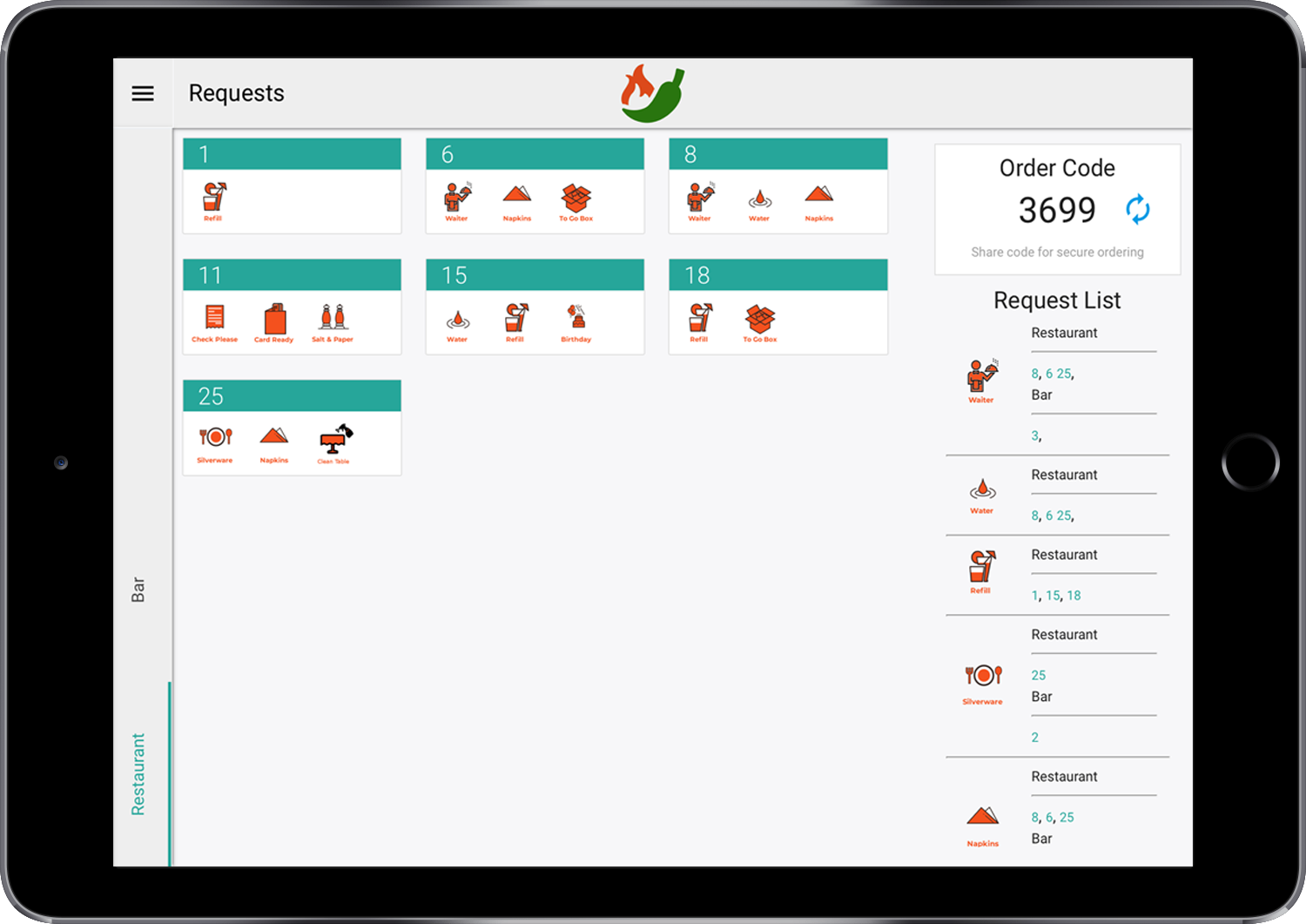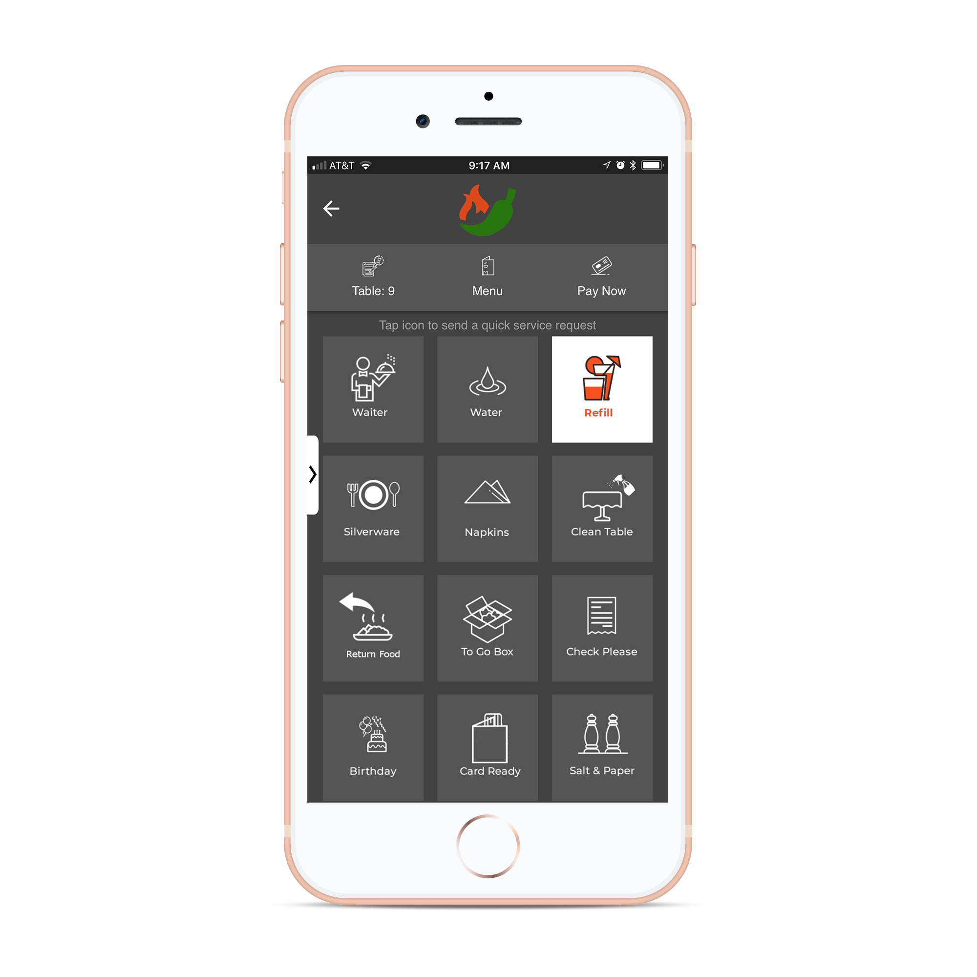 "On-Demand Service" for your dining needs. A touch sends your dining request such as drink re-order, silverware, clean table, check please, take card etc. directly to the staff.